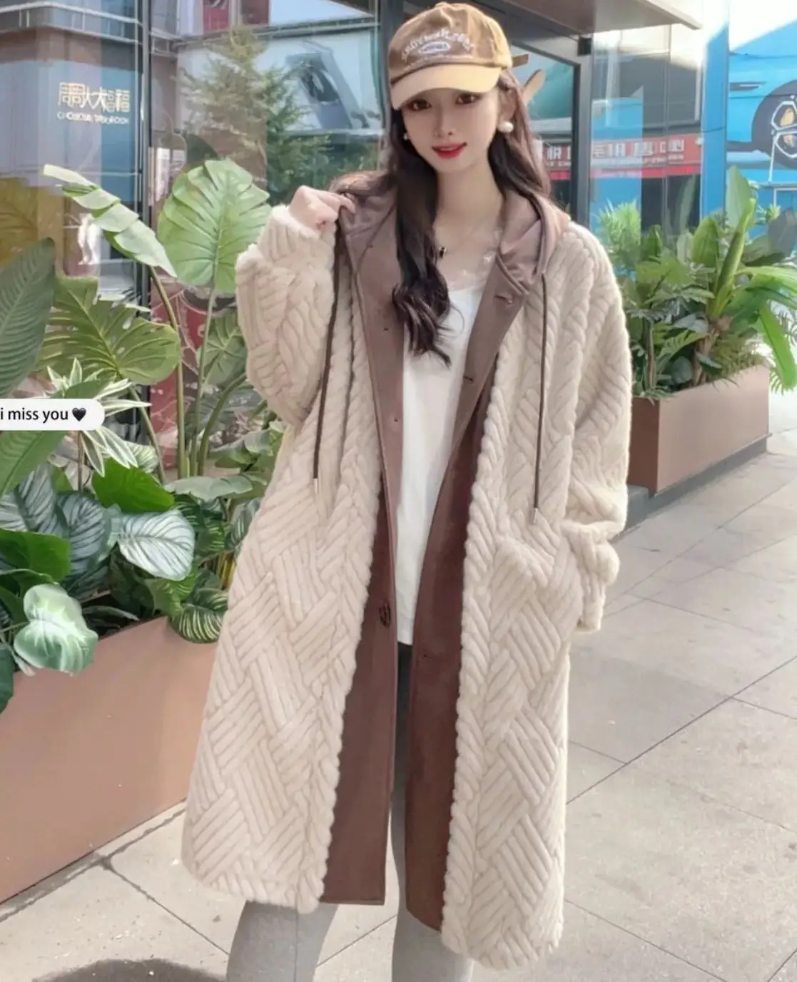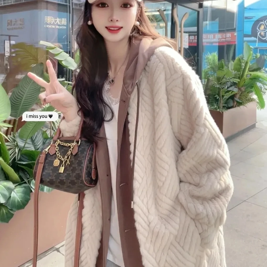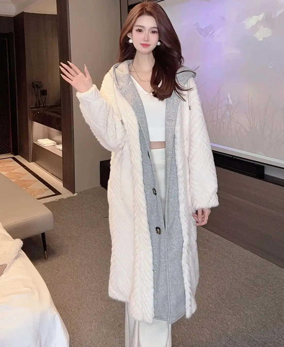 Faux Mink Fur Coat for Women,Single Breasted Long Jacket,Fake Two Items,High Quality,Hooded,Female Clothes,New,Winter