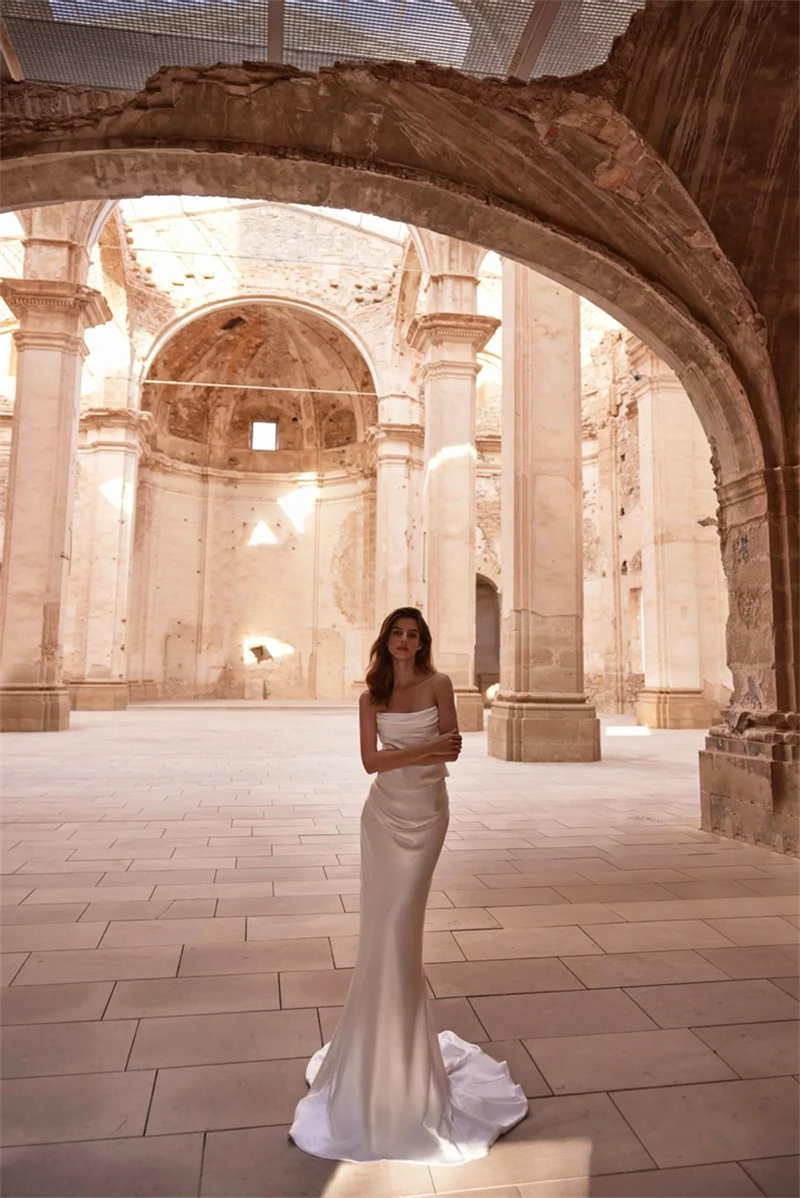 Simple Ivory Satin Mermaid Wedding Dresses lady Customized Strapless Bridal Dress with Train Long Sleeveless Vestido Bride Gown