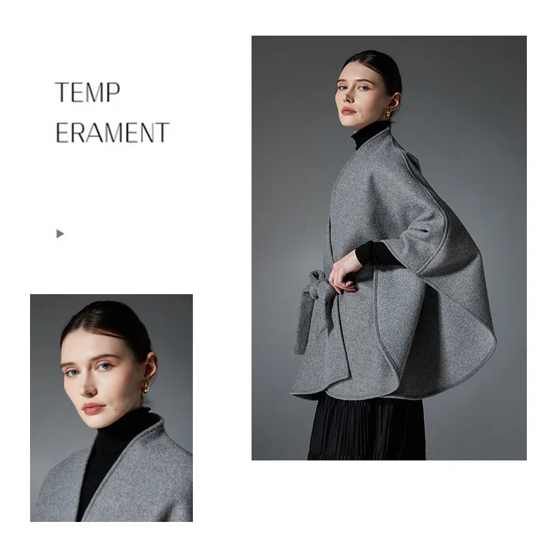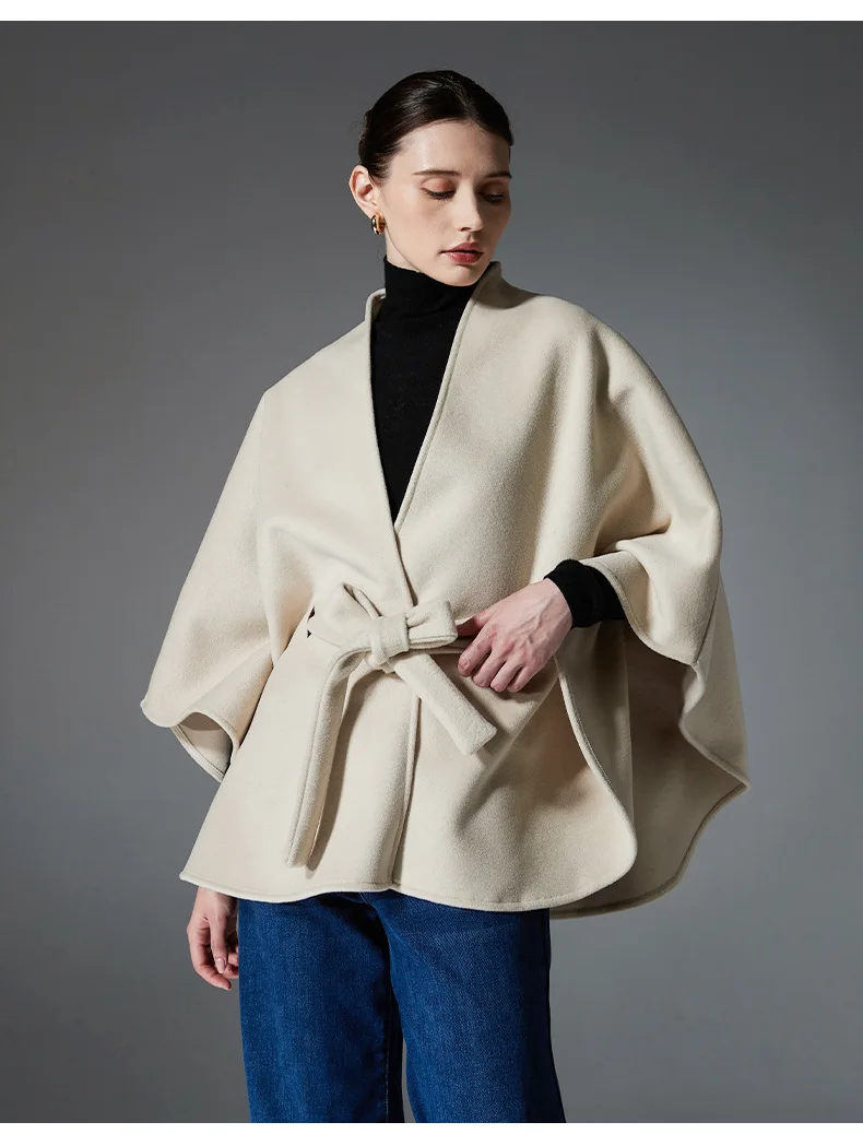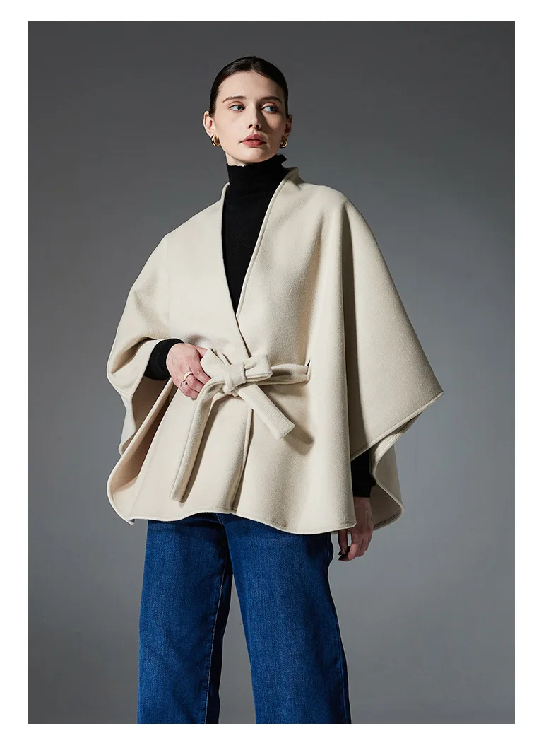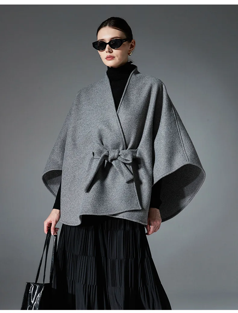 Stylish Designer Double Sides Woolen Cape Coat Women Autumn Winter Belt Loose Slim Surcoat Cloak Elegant Outerwear Versatile