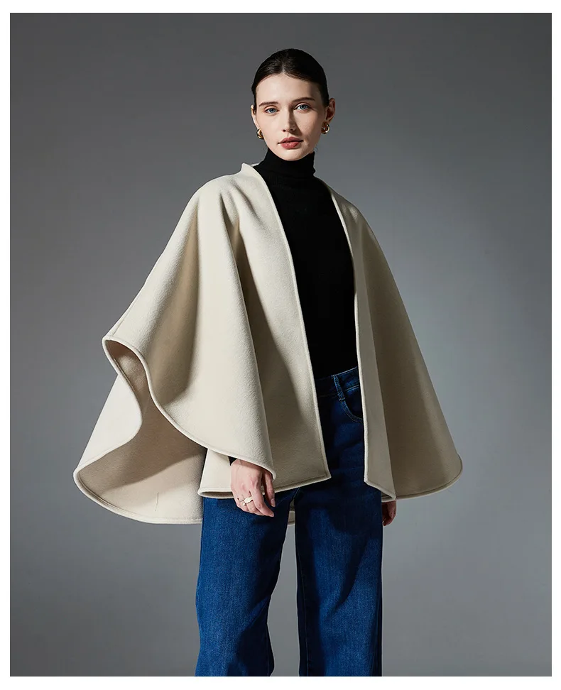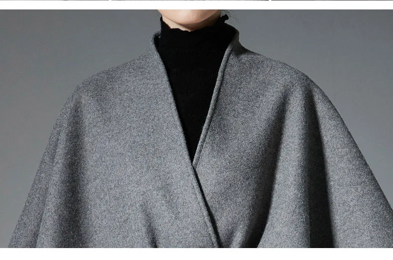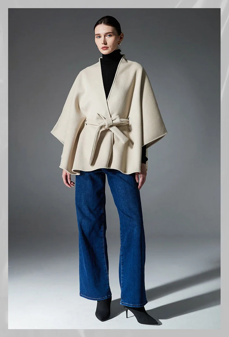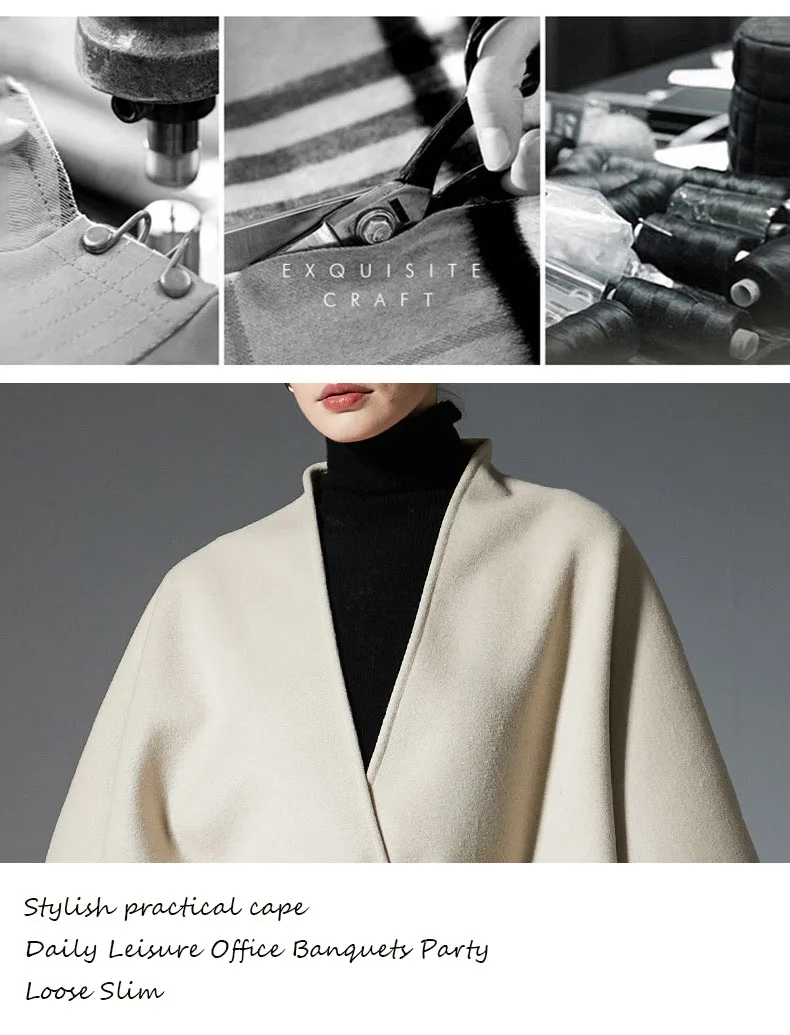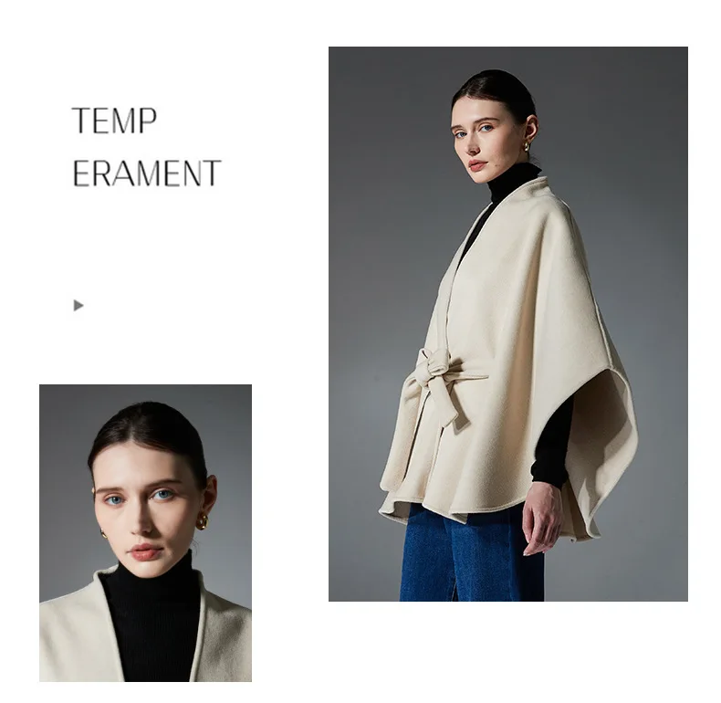 Stylish Designer Double Sides Woolen Cape Coat Women Autumn Winter Belt Loose Slim Surcoat Cloak Elegant Outerwear Versatile